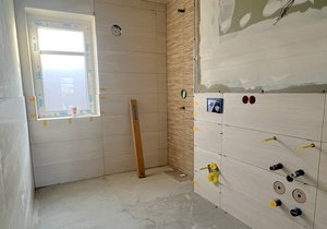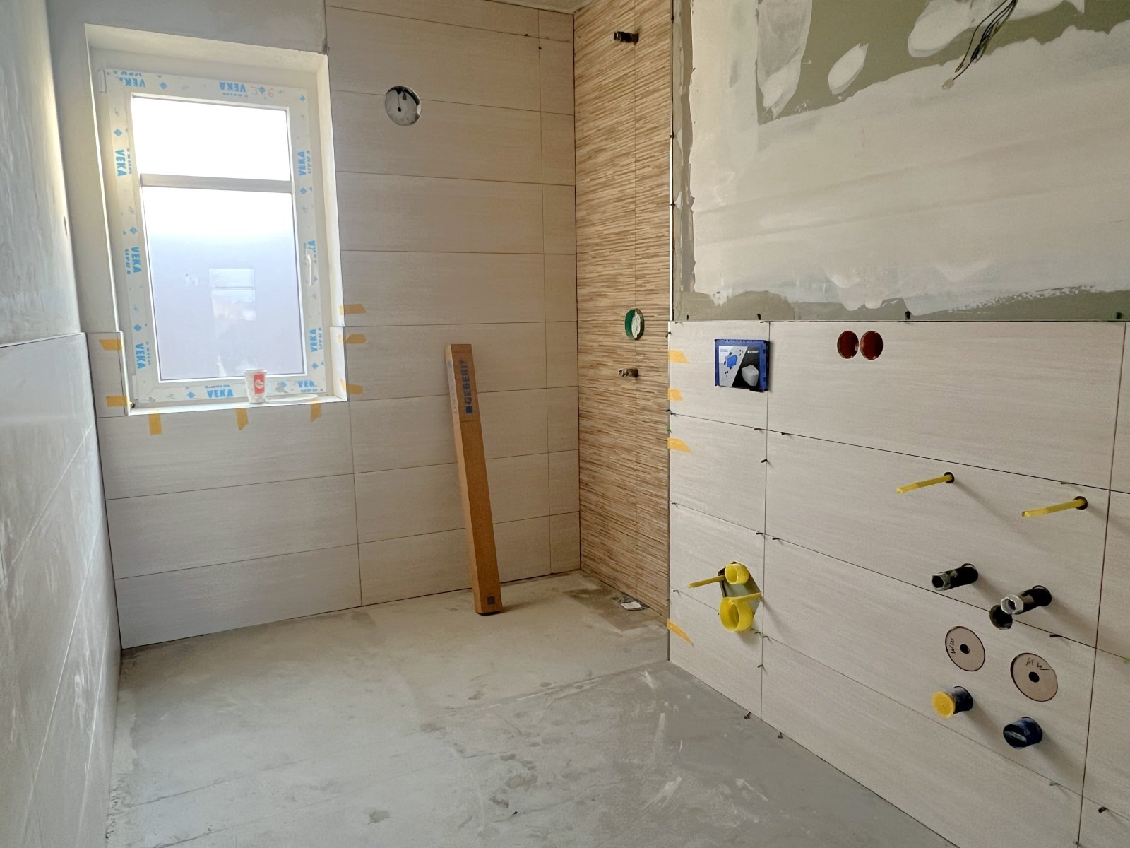 Das Badezimmer ist modern gestaltet und verfügt über eine Fußbodenheizung, einem weißen Elektro- Handtuchheizkörpereiner, einer Regendusche mit zweitem Verbraucher sowie einer Echtglas-Duschabtrennung. Wände und Decken sind mit Feinvlies tapeziert und weiß gestrichen, während Flur, Wohn- und Schlafzimmer sowie der Abstellraum mit einem hochwertigen Design-Vinylboden in Holzoptik ausgestattet sind. Das Bad ist zeitgemäß und stilvoll gefliest.