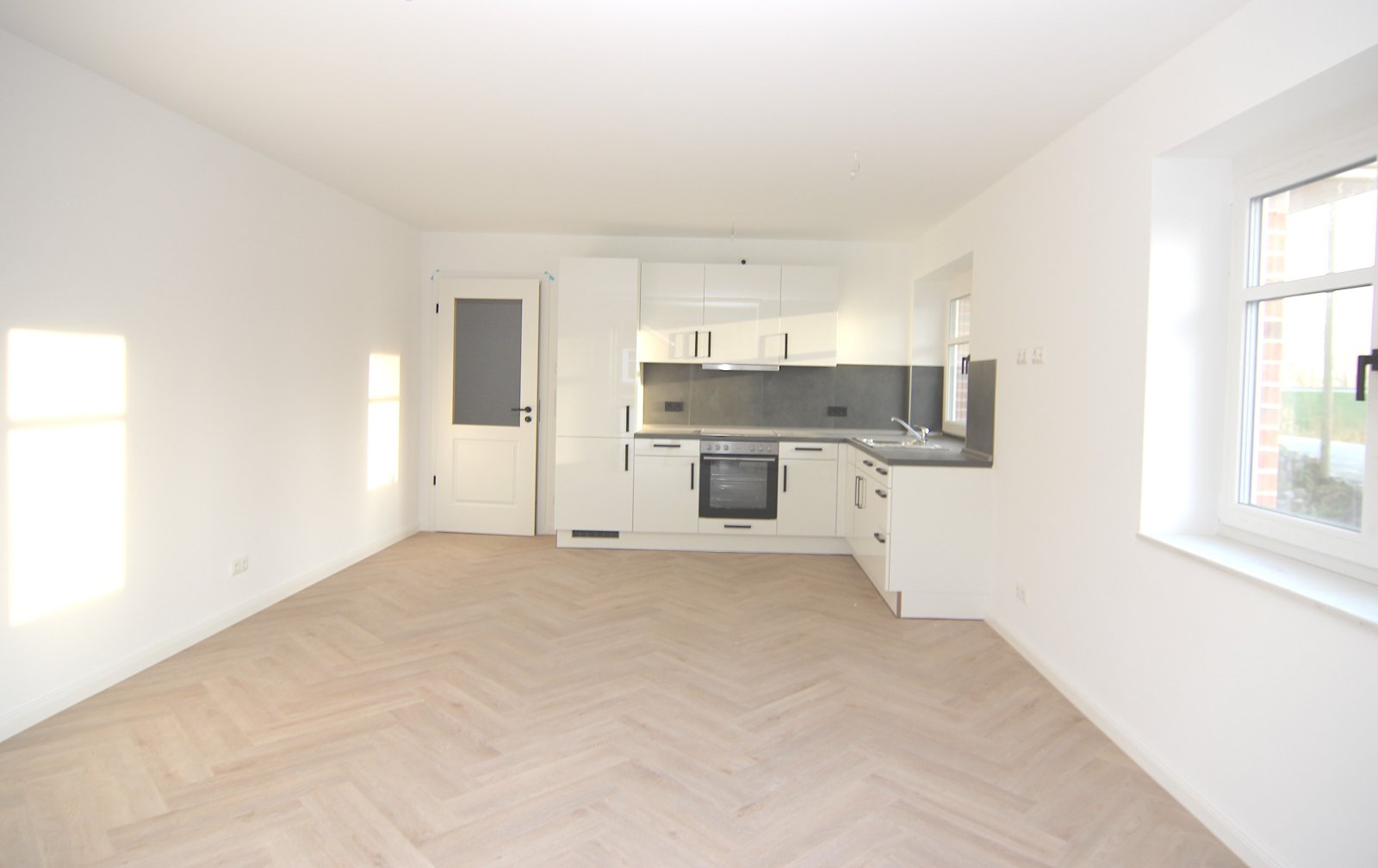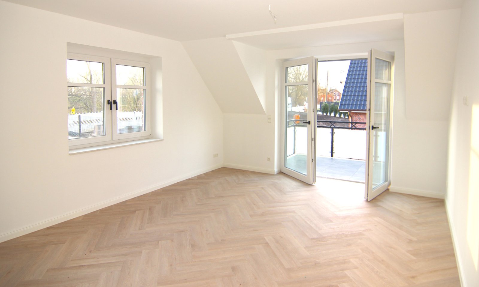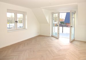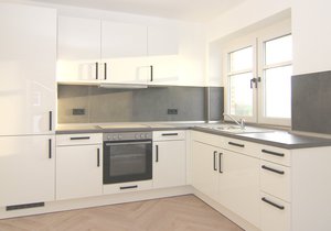 Die Wohnung ist hell und geräumig und besticht durch den offenen, ca. 30 m² großen Wohnbereich, in welchem die moderne Einbauküche (inkl. E-Herd mit Glaskeramikkochfeld, Umluft-Dunstabzug und Kühl-/Gefrierkombi) integriert ist.