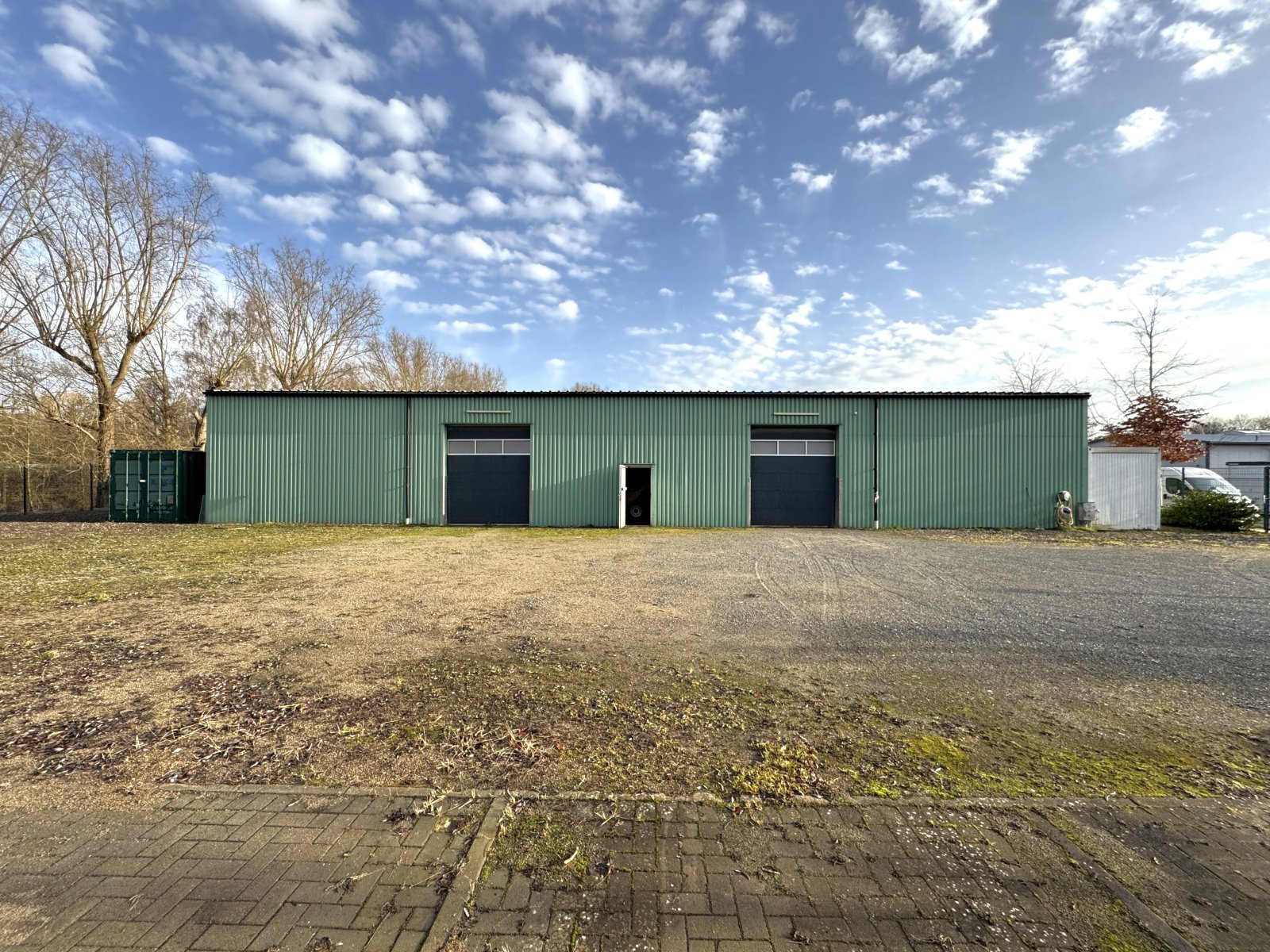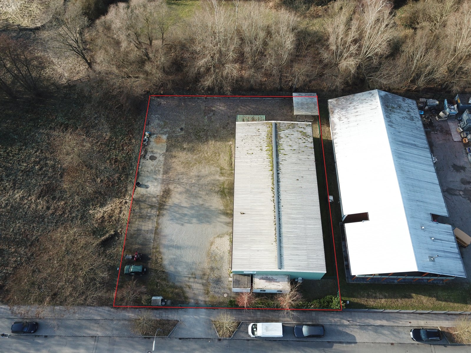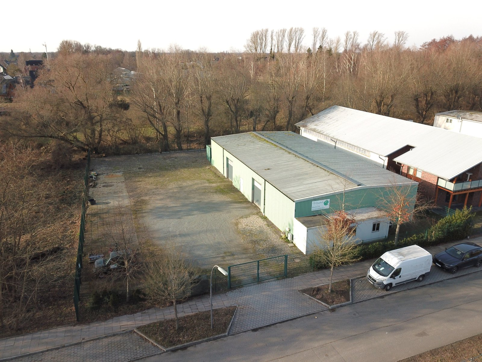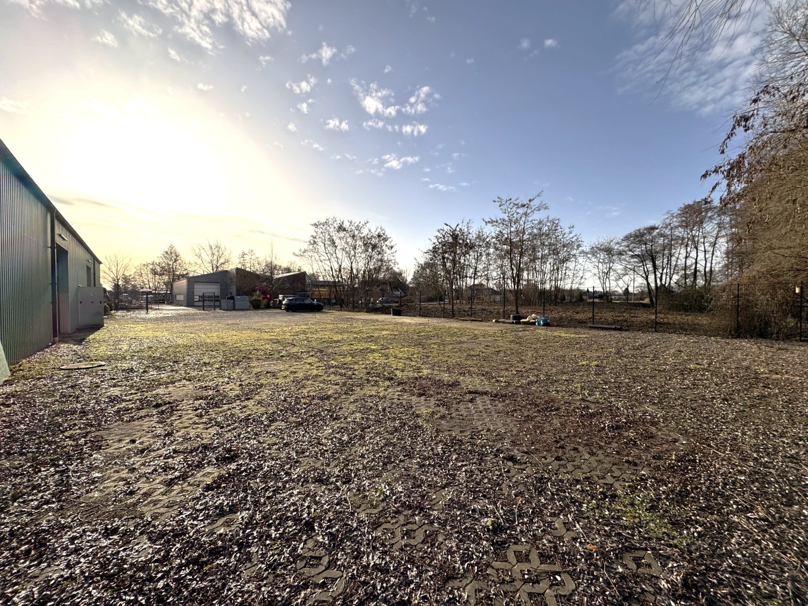 Die befestigten Außenflächen ermöglichen Rangierverkehr, Parkmöglichkeiten und zusätzliche Lagerung, während das geringe Verkehrsaufkommen eine angenehme Arbeitsumgebung schafft.
