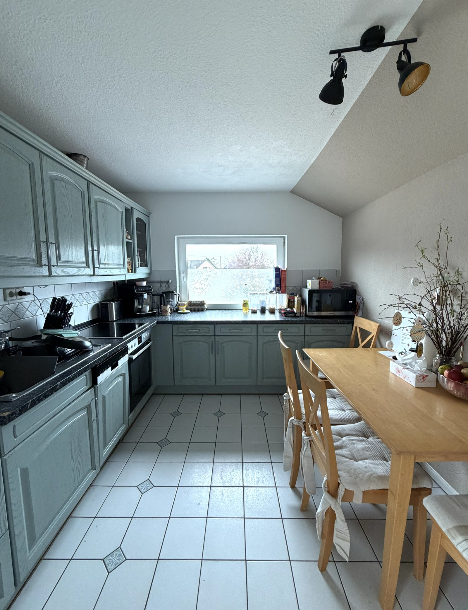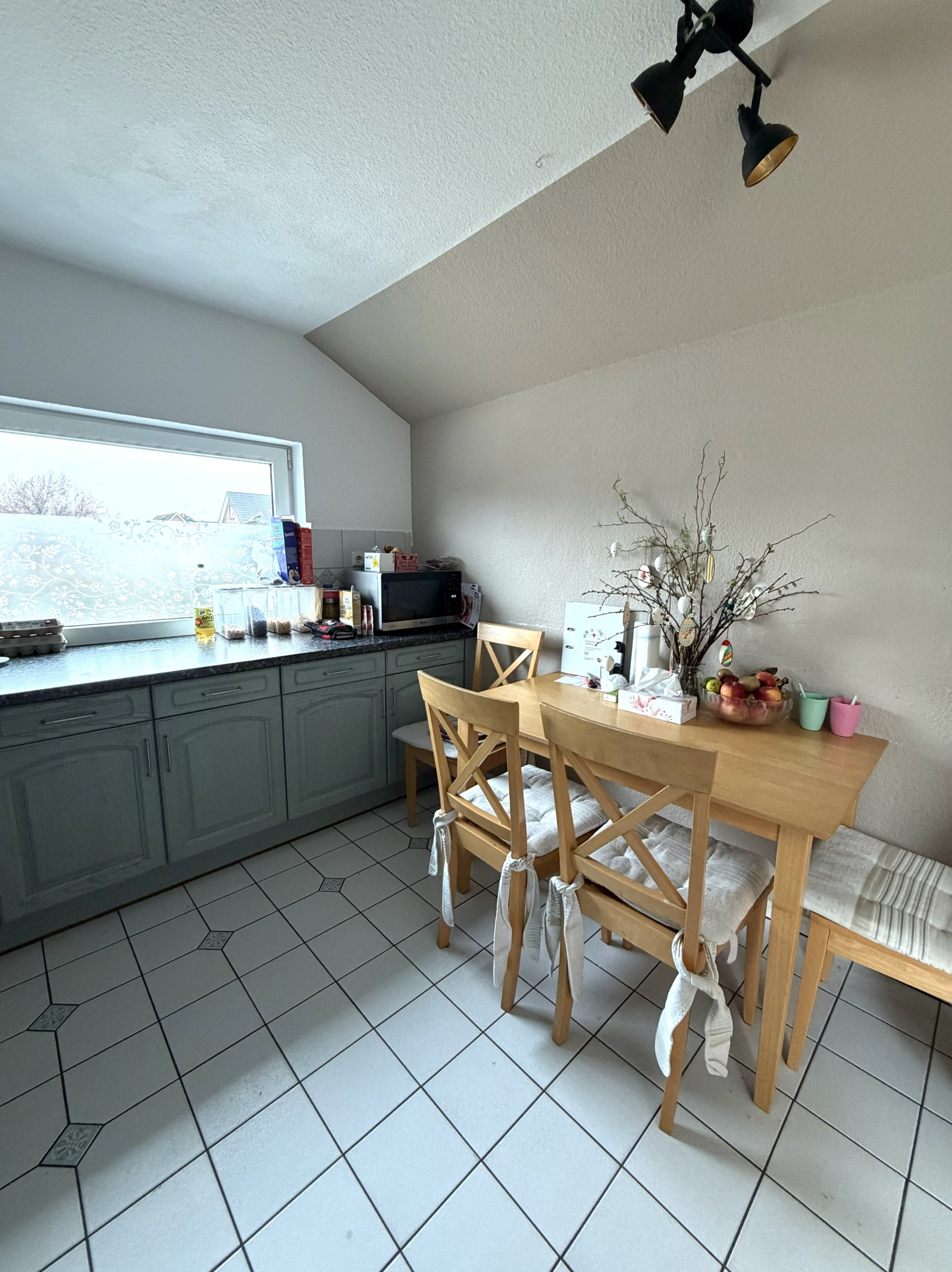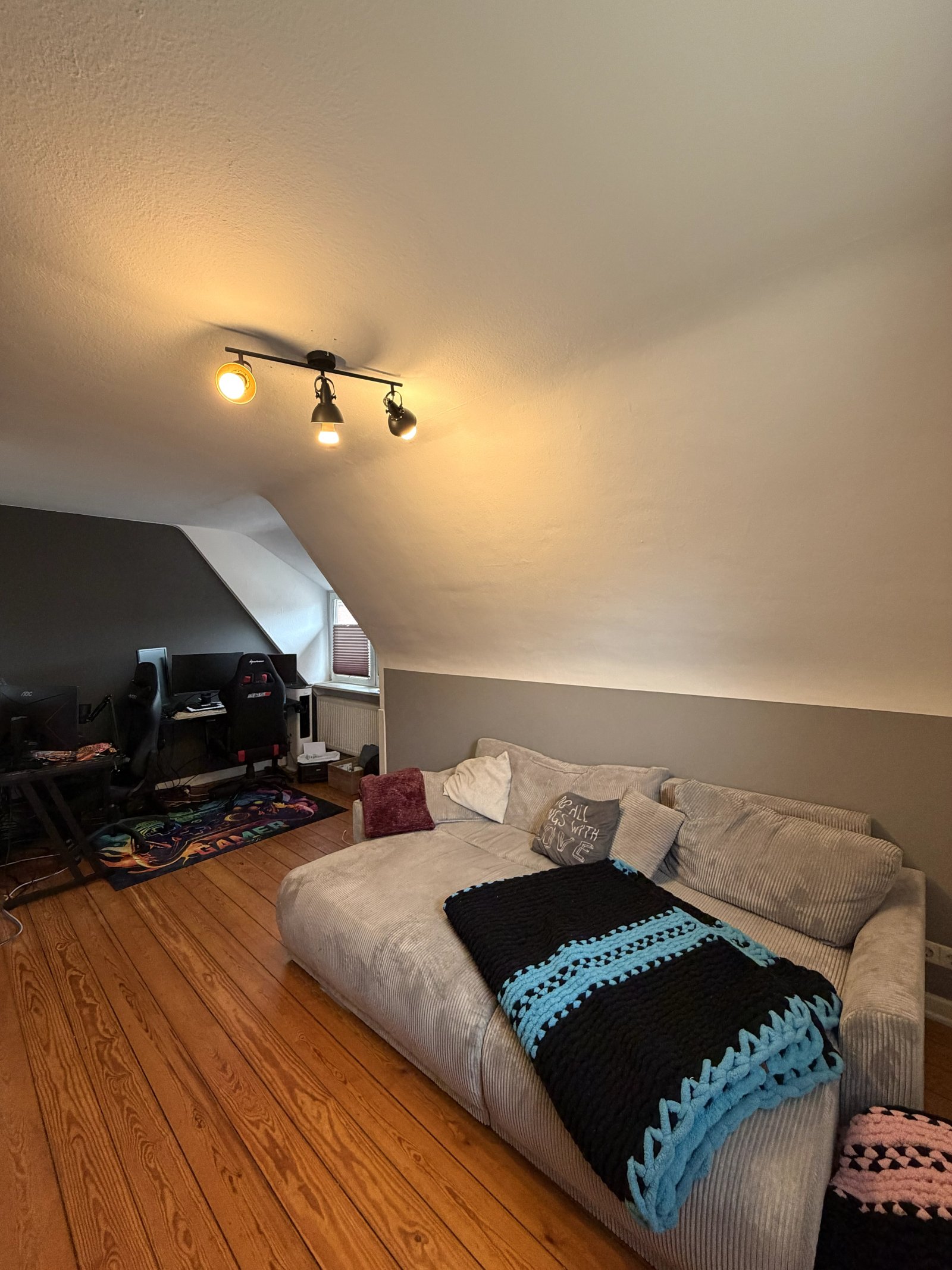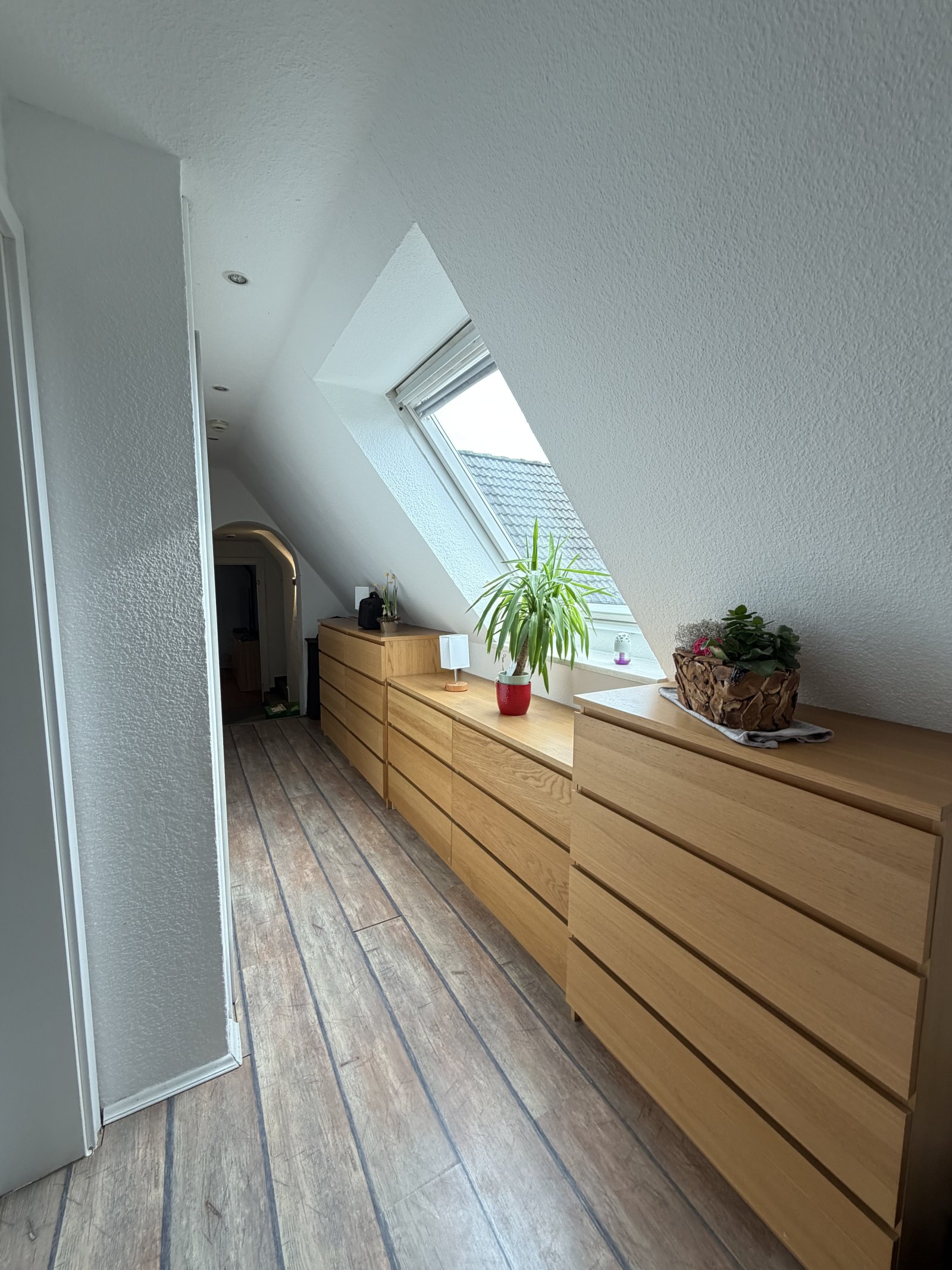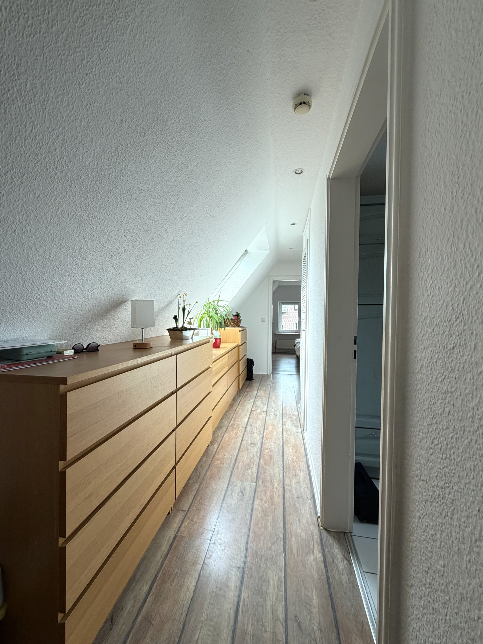 Im Dachgeschoss liegt der eigentliche Wohnbereich mit zwei großzügigen und einem kleineren Zimmer. Die Räume sind mit Laminat- bzw. Dielenböden ausgestattet. Im Schlafzimmer ist ein praktischer Einbauschrank vorhanden. Die Einbauküche umfasst einen E‑Herd, Dunstabzug, eine Kühl‑/Gefrierkombination sowie einen Geschirrspüler. Das Voll‑/Duschbad ist gefliest und verfügt über eine Echtglas‑Duschabtrennung, einen Handtuchheizkörper und funktionale Einbauten.