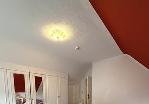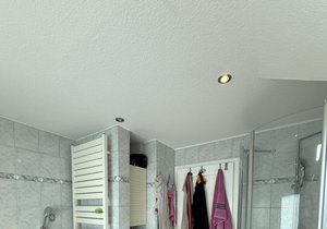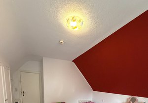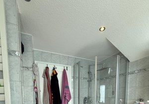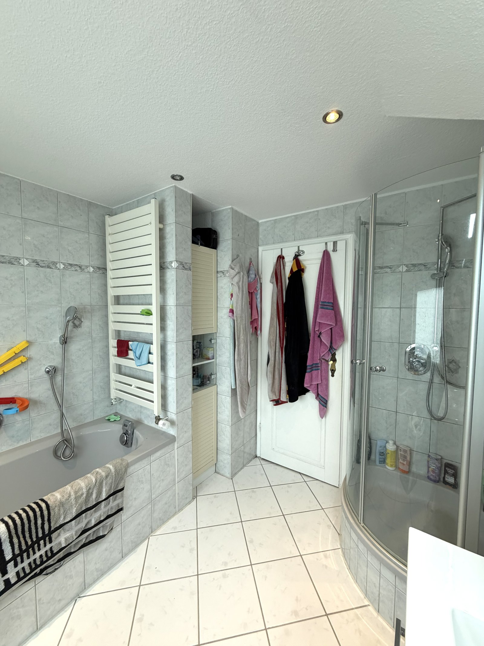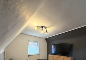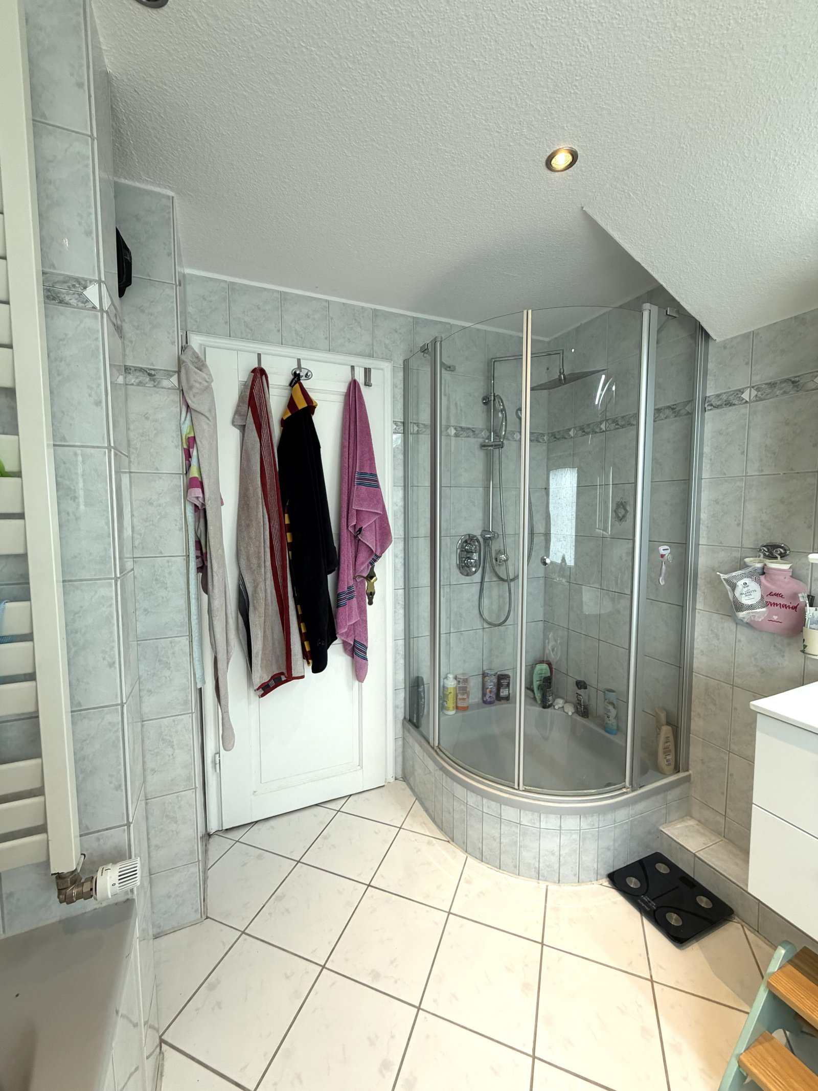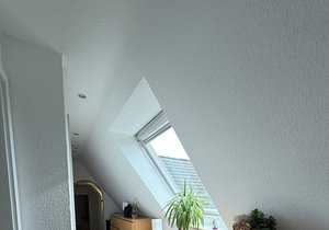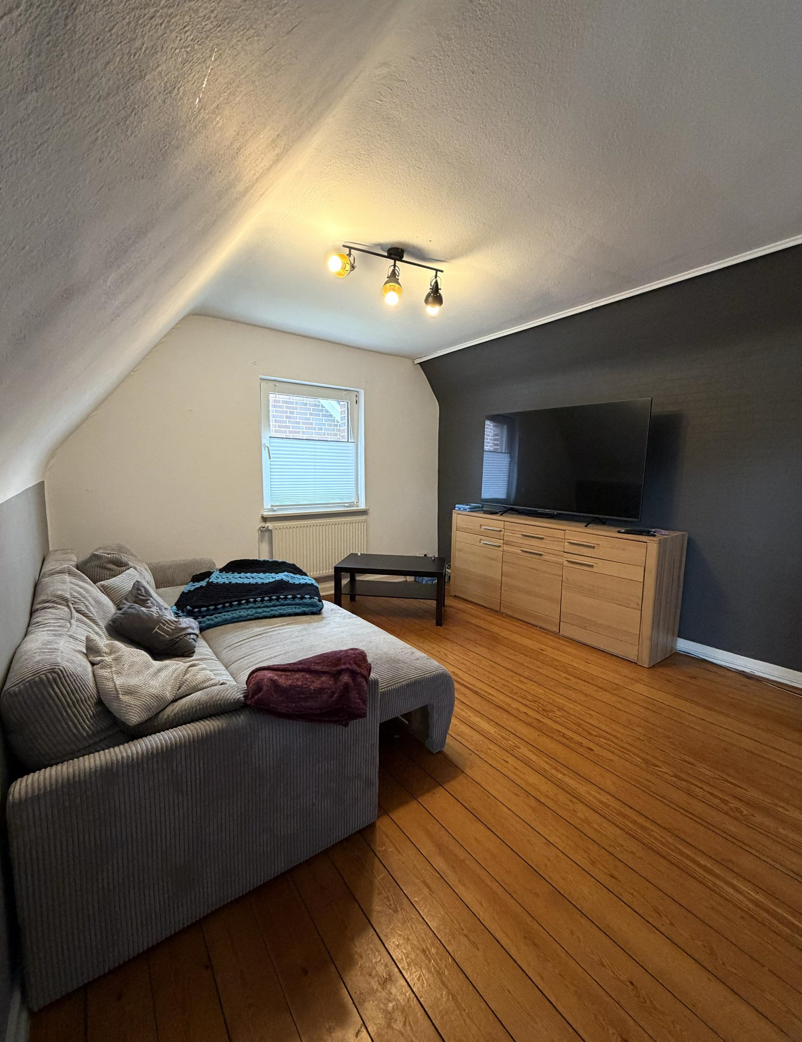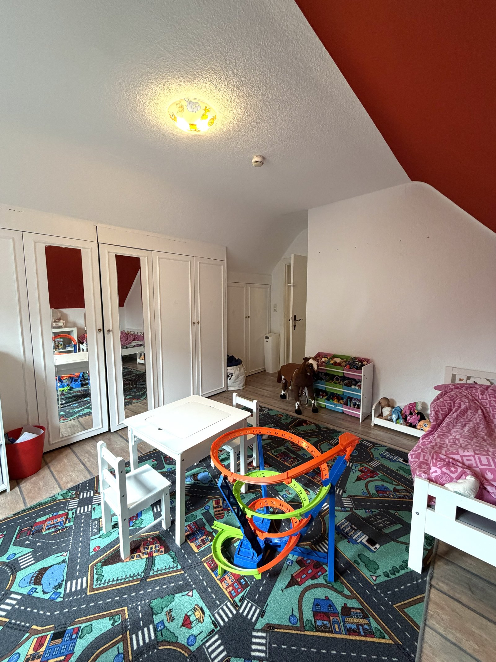 Im Dachgeschoss liegt der eigentliche Wohnbereich mit zwei großzügigen und einem kleineren Zimmer. Die Räume sind mit Laminat- bzw. Dielenböden ausgestattet. Im Schlafzimmer ist ein praktischer Einbauschrank vorhanden. Die Einbauküche umfasst einen E‑Herd, Dunstabzug, eine Kühl‑/Gefrierkombination sowie einen Geschirrspüler. Das Voll‑/Duschbad ist gefliest und verfügt über eine Echtglas‑Duschabtrennung, einen Handtuchheizkörper und funktionale Einbauten.