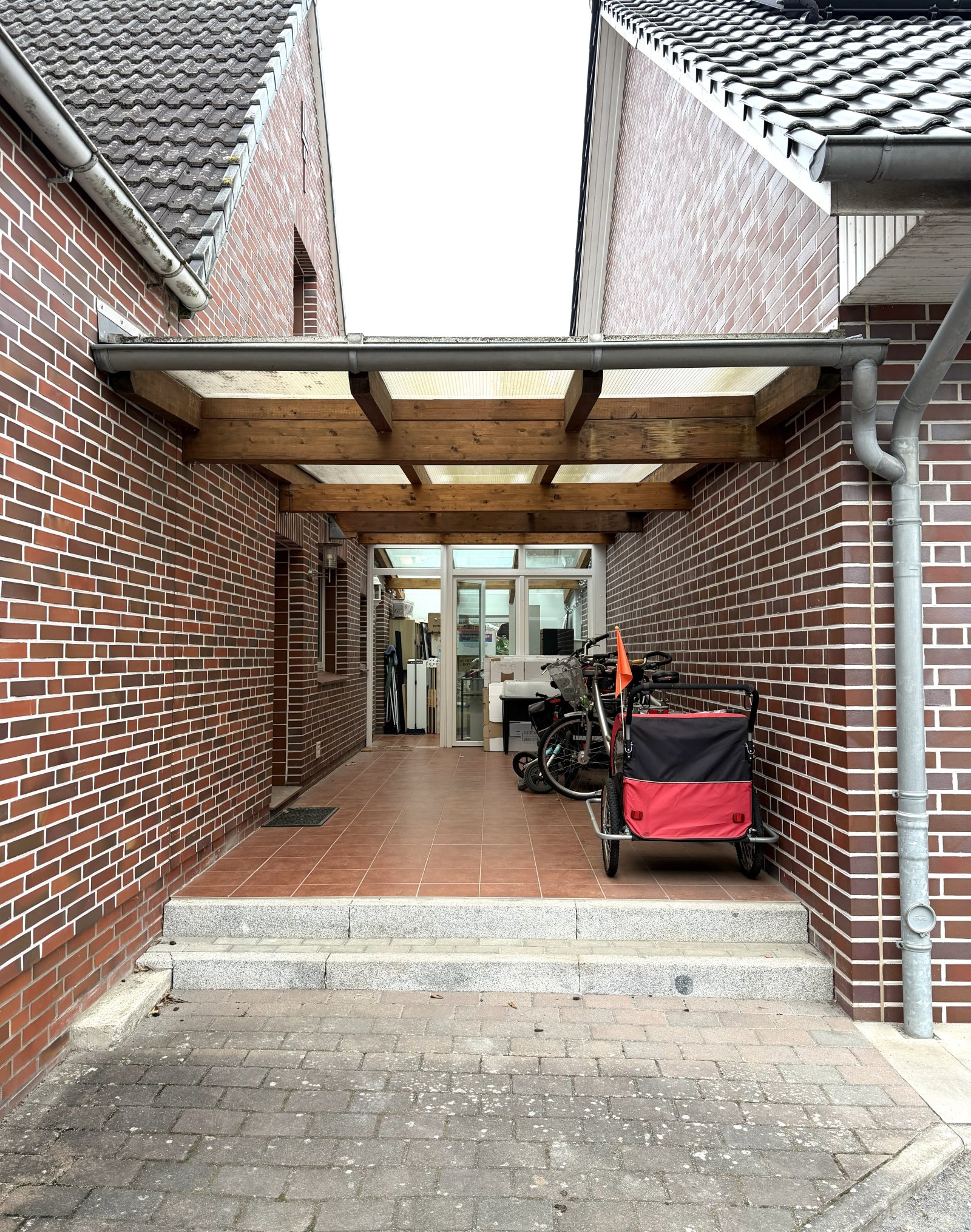 Ein Pkw‑Stellplatz im Carport mit angrenzendem Außenabstellraum (z. B. für Fahrräder) ist vorhanden und wird für 60 EUR pro Monat mit vermietet.