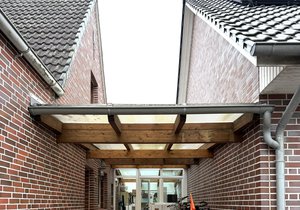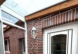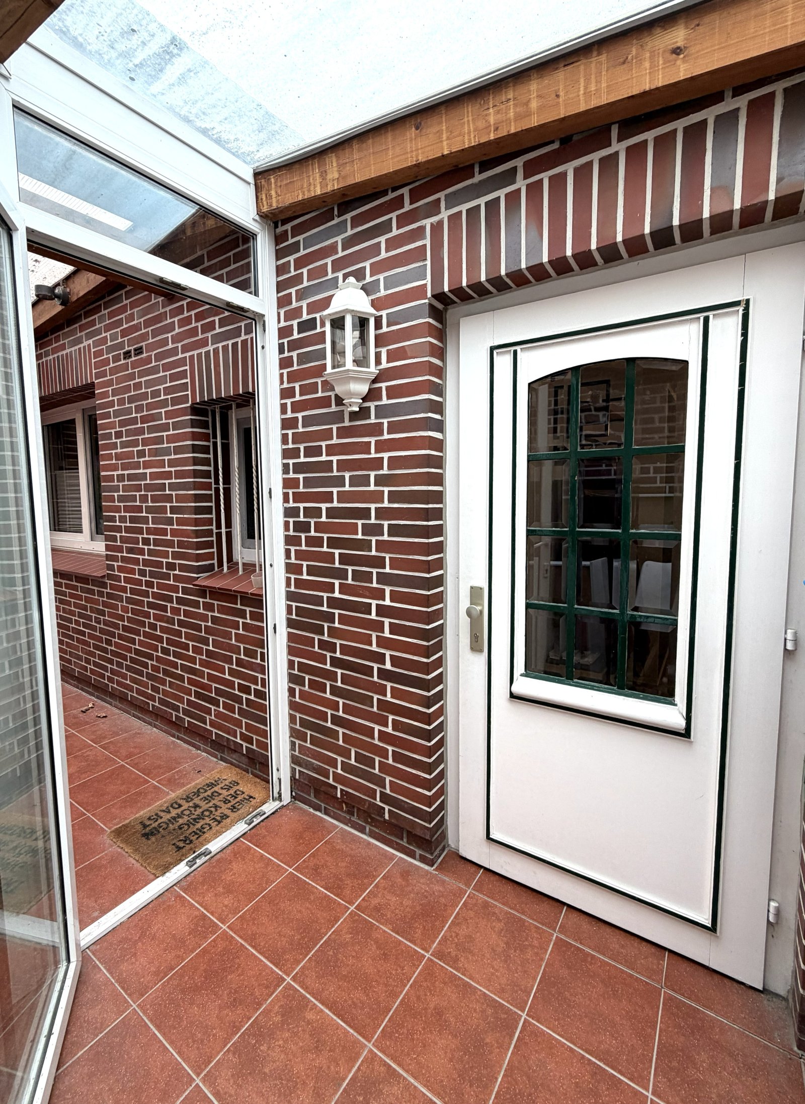 Der überdachte Eingangsbereich führt in einen zur Wohnung gehörenden, unbeheizten Wintergarten. Von hier aus führt der Zugang in den Flur im Erdgeschoss, der Platz für eine Garderobe bietet. Ein Abstellraum mit Waschmaschinenanschluss befindet sich ebenfalls auf dieser Ebene.