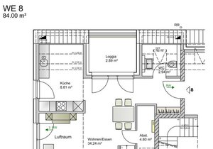 Der offene Wohn- und Essbereich ist das Herzstück dieser Immobilie - lichtdurchflutet, einladend und ideal geschnitten. Der Küchenbereich fügt sich harmonisch ein und führt direkt zu einer Loggia, die zum Verweilen mit Blick ins Grüne einlädt. Ein besonderes Highlight ist der offene Spitzboden: Über eine Treppe erreichbar, eröffnet er eine Galeriefläche, die sich hervorragend als Arbeitsplatz, gemütliche Leseecke oder kreativer Rückzugsort nutzen lässt - mit offenem Blick ins Wohnzimmer und hinaus ins Grüne.