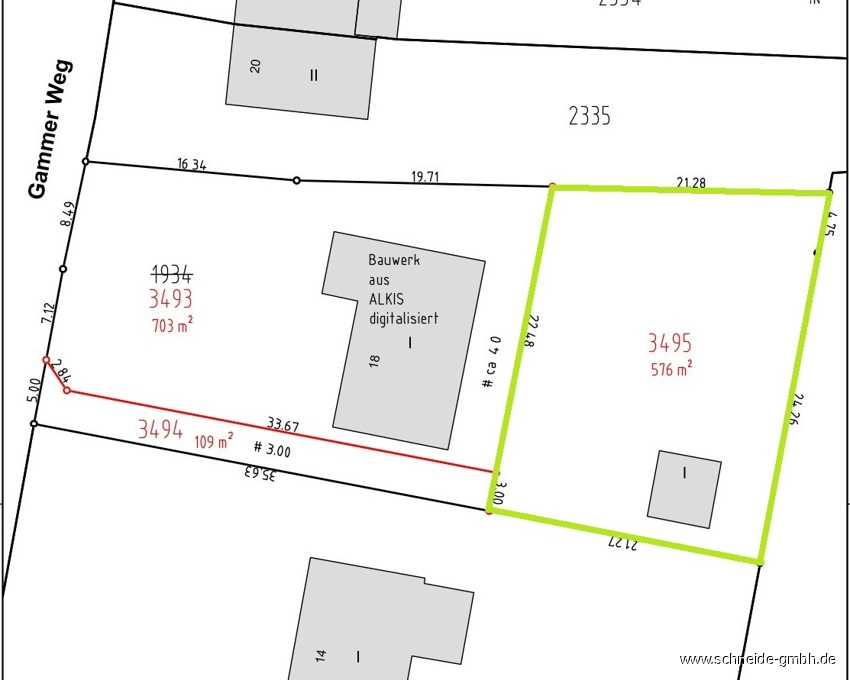 Hierfür wird ein separates Flurstück (im Lageplan rot markiert und mit Flurstück 3494 bezeichnet, ca. 109m²) angelegt, an welchem Sie mit dem Erwerb einen Miteigentumsanteil von 1/2 erhalten. Miteigentümer dieser Fläche ist der Eigentümer des angrenzenden Einfamilienhauses. Die Instandhaltung und die Verkehrssicherung obliegen den jeweiligen Eigentümern im Verhältnis Ihrer Miteigentumsanteile.