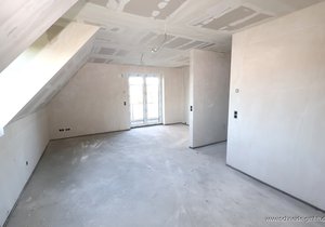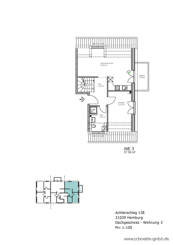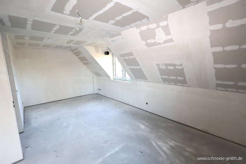 Die Wohnfläche beträgt ca. 80 m² und verteilt sich auf das Wohnzimmer mit offenem Kochbereich, Schlafzimmer, Duschbad mit Handtuchheizkörper und einem Flurbereich sowie einem großen Studiozimmer und Abstellraum im Spitzboden.