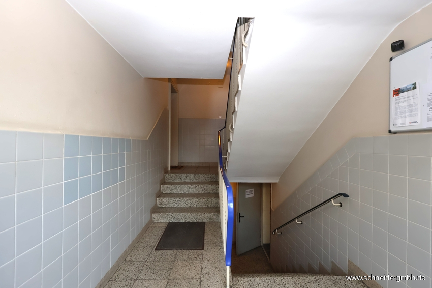 • Treppenhaus: Wände mit Rauputz, Kunstofffenster, Treppengeländer aus Metall, Fliesen