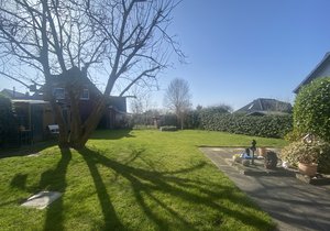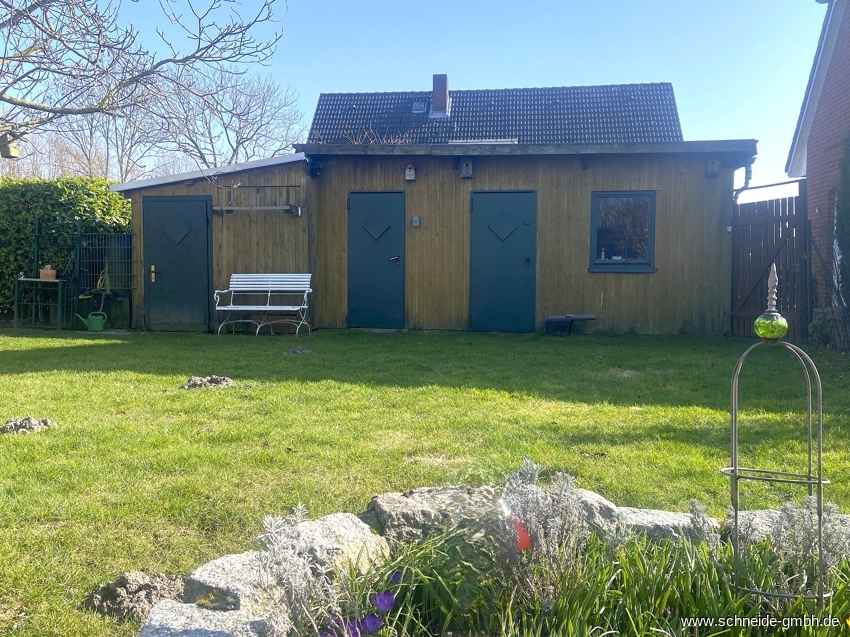 Die Außenanlage besticht durch den geschmackvollen Süd-West-Garten und ist durch Hecken, Sträucher und Rasenflächen eingefriedet. Eine große Terrasse, die teilweise überdacht ist und eine Markise sind vorhanden. Das Gartenhaus mit ca. 24 m² Grundfläche sowie einen Carport, jeweils aus 2003, fügen sich geschickt in den hinteren Gartenbereich ein. Ein optischer Blickfang ist ein gemauerter Brunnen, welcher jedoch nicht angeschlossen ist.