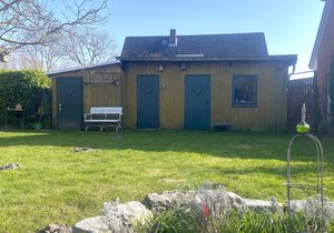 • Gartenhaus (Bj. 2003), Holzbauweise mit Betonplatte, Dach mit Bitumen-Wellplatten belegt