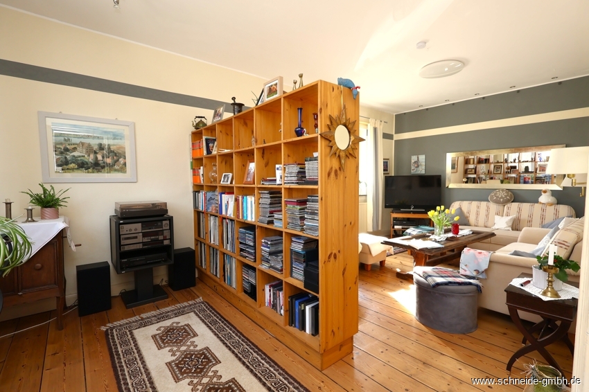 Das Erdgeschoss mit ca. 64 m² Wohnfläche überzeugt durch die gelungene Raumaufteilung und ist sowohl von der Straßenseite als auch vom Untergeschoss begehbar. Ein geräumiges Wohnzimmer, zwei weitere Zimmer, von denen sich eines bei Bedarf gut als Küche nutzen lässt, sowie ein Wannenbad aus den 1980er Jahren mit Blick in den Garten bieten ausreichend Platz. Charmante Holzdielenböden in den Wohnräumen und im Flur, stilvolle Altbautüren und die angenehme Deckenhöhe verleihen dieser Ebene eine besonders wohnliche Atmosphäre.